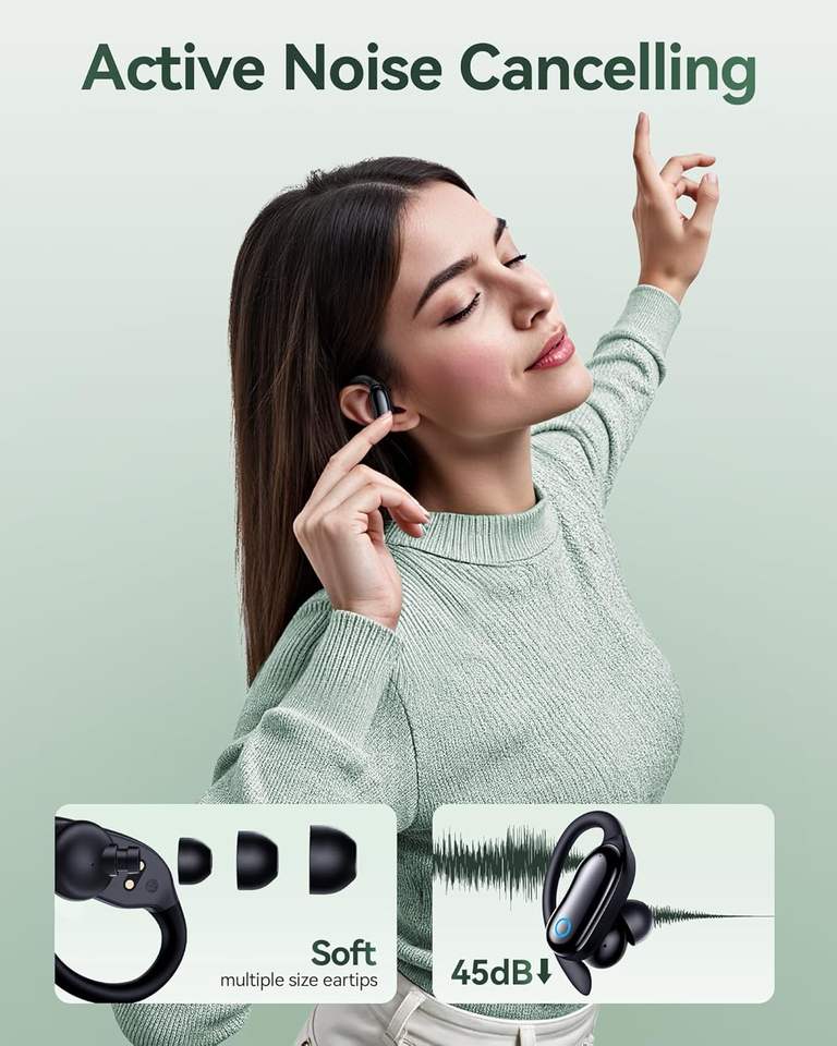 หูฟังไร้สาย GMN ANC, เล่นได้นาน 96 ชั่วโมง, บลูทูธ, เสียงเบสสเตอริโอ, จอแสดงผลแบตเตอรี่คู่, กันน้ำระดับ IPX7, ตะขอเกี่ยวหูสำหรับเล่นกีฬา