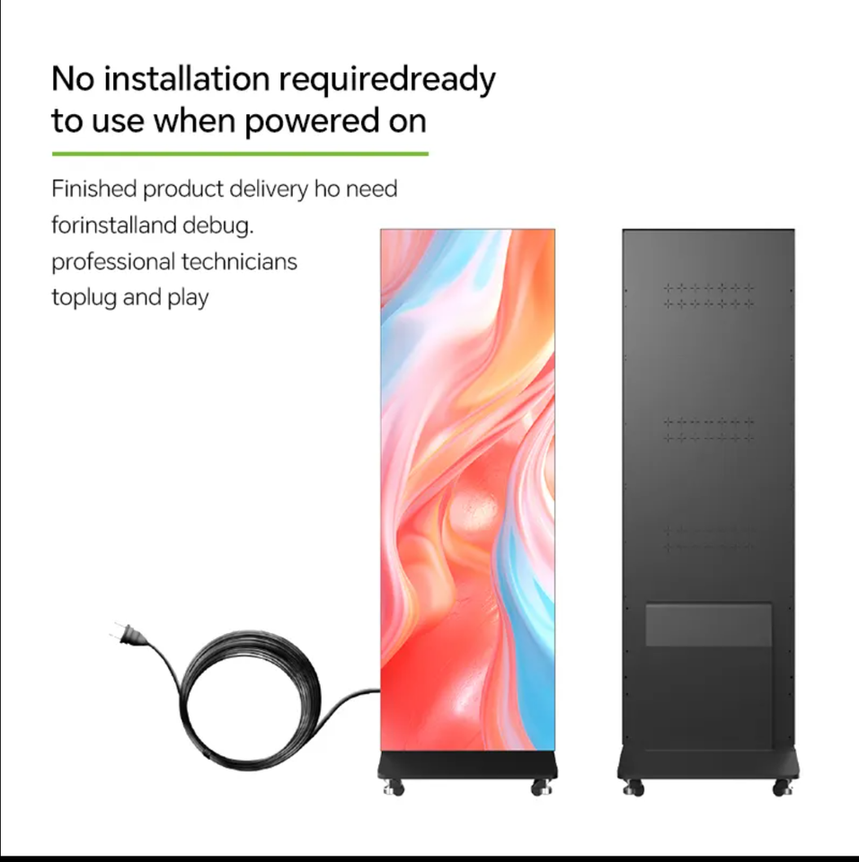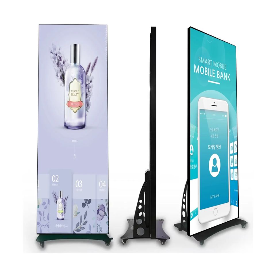 เครื่องจักรโฆษณาดิจิทัลอัจฉริยะ gob LED โปสเตอร์เคลื่อนไหวได้พกพาได้ออกแบบล้อแบบสากลแสดงภาพ P2.5พิกเซลสำหรับภาพข้อความ