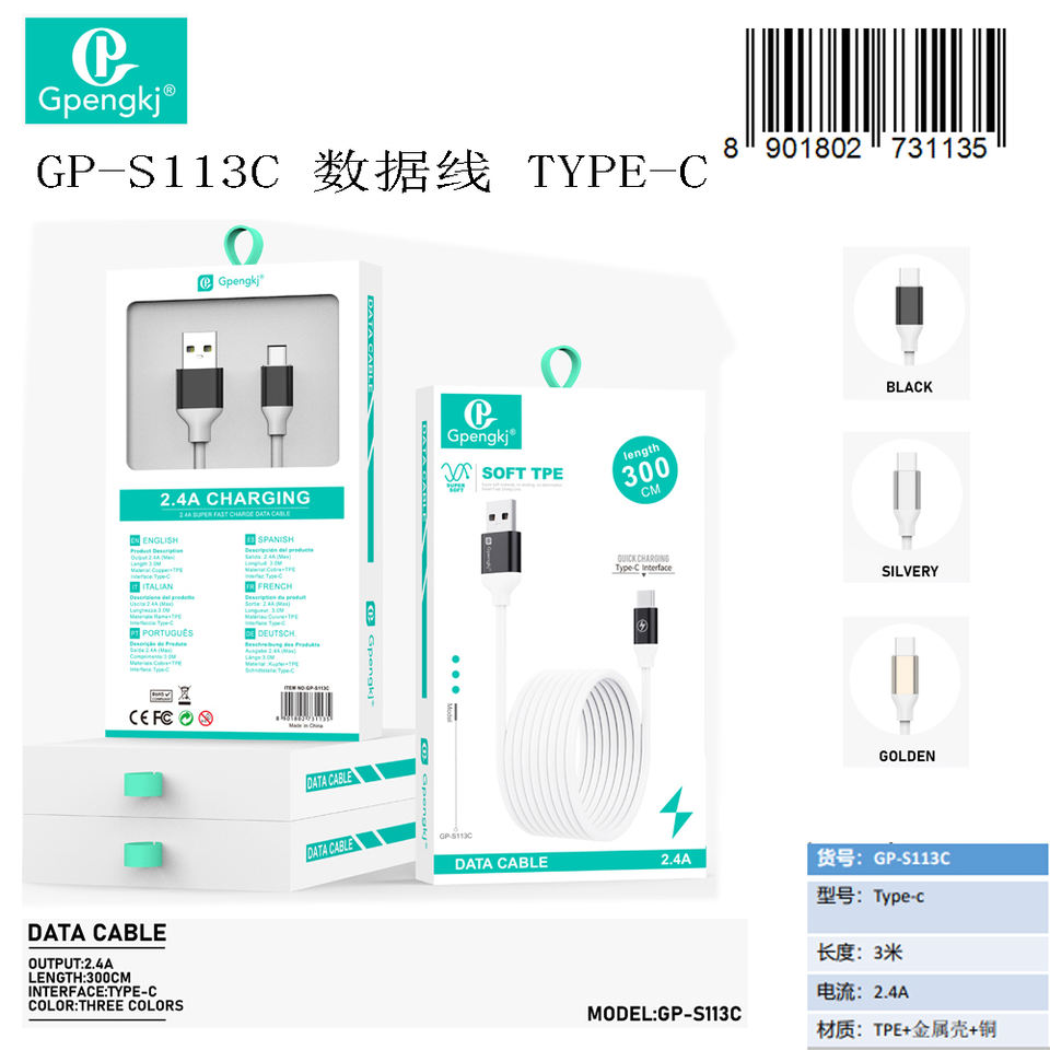สายเคเบิลข้อมูลเกพงเคจ ไทป์ ซี 300 ซม. ชาร์จเร็วสำหรับโทรศัพท์มือถือ วัสดุ TPE ตัวนำทองแดงบริสุทธิ์