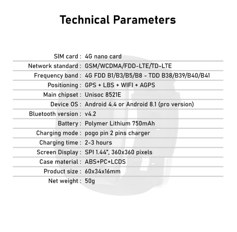 นาฬิกาปลุก, รีโมทคอนโทรล, การแจ้งเตือนการโทร, รับสาย, อัตราการเต้นหัวใจติดตาม, กิจกรรมติดตาม, โทรด้วยเสียง, Accelerometer, ปุ่ม SOSฟังก์ชัน