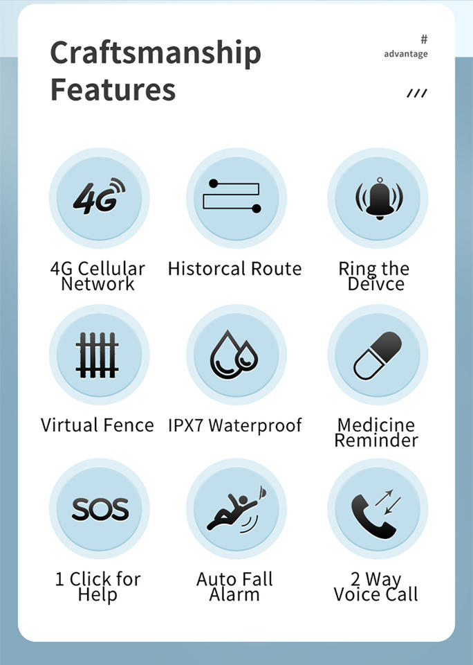 ไวไฟ, GPS นำทาง, 4G, 3G, แอปควบคุม, IP67 กันน้ำ, เด็ก, For Pets, สำหรับผู้สูงอายุ, ปุ่ม SOS, สำหรับ Loneworker, สำหรับผู้ป่วย, SDK ม, 5gลักษณะ