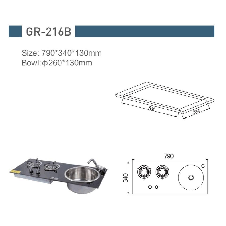 เตาแก๊สและอ่างล้างจาน GR-216B สำหรับรถบ้านและเรือยอชท์ ขนาด 790*340*130 มม. กระจกนิรภัยและสแตนเลส อุปกรณ์ตกแต่งภายใน