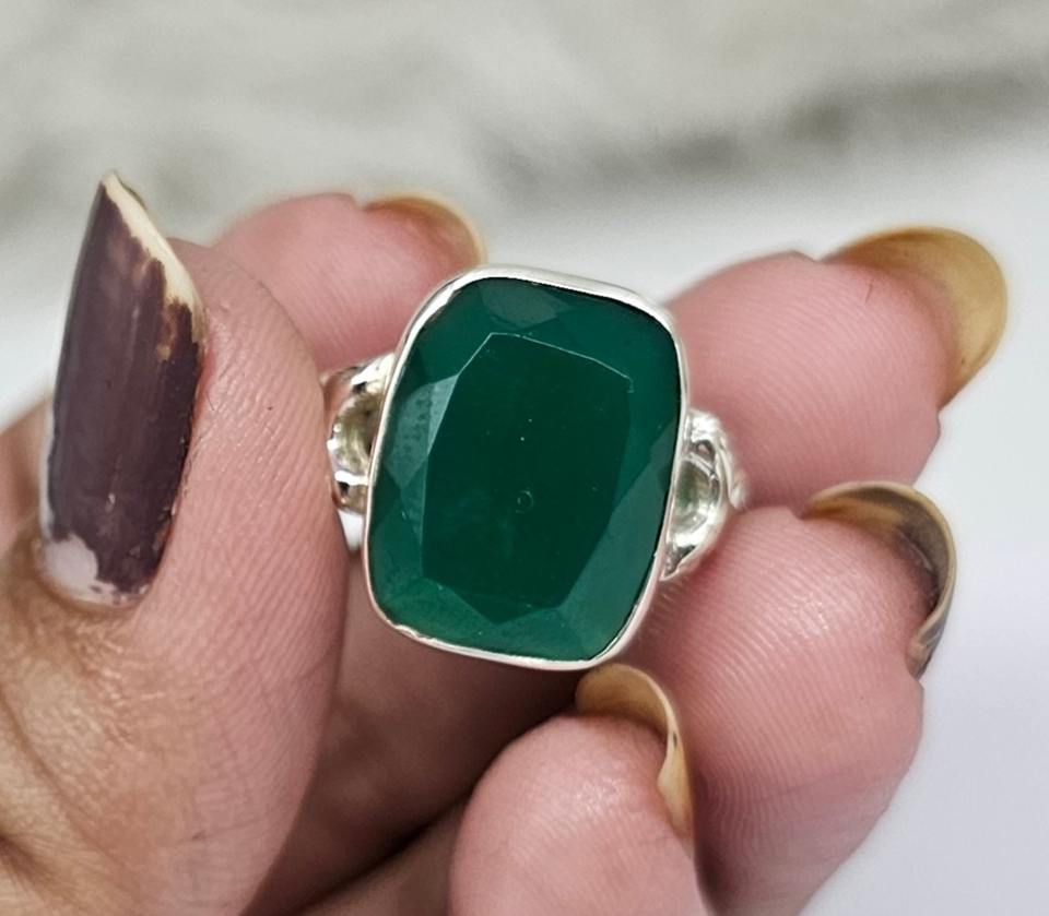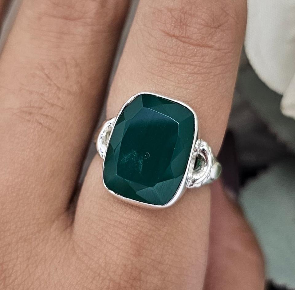 แหวนสไตล์คลาสสิกสีเขียวโอนิกซ์สีเงินพร้อมเทคโนโลยีฝังหนามเตย