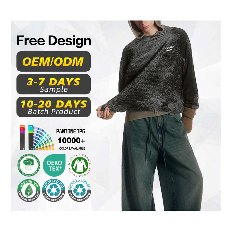 GRS Certification Sweater Factory Custom logo Men New Fashion Design Cotton Acid Wash Knitted Pullover Sweater for Autumn Winter