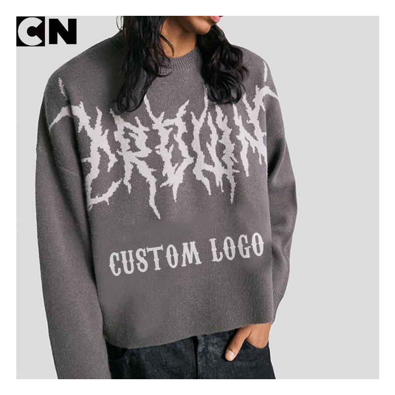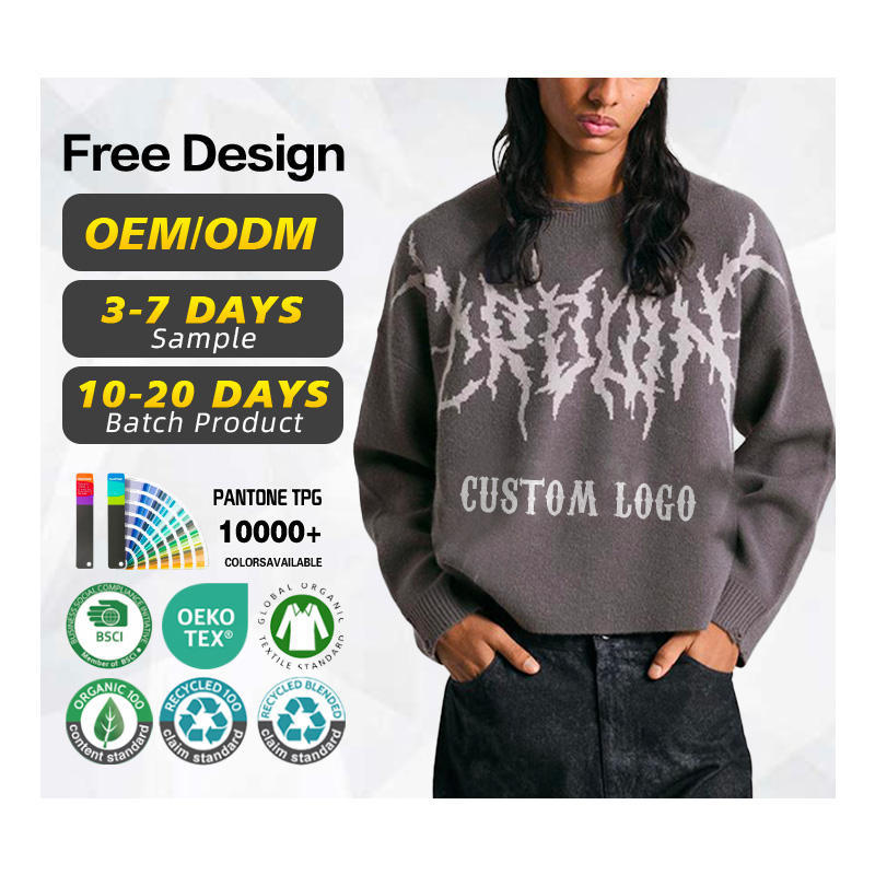 ผู้ผลิตเสื้อสเวตเตอร์ที่ได้รับการรับรอง GRS รับทำโลโก้ เสื้อสเวตเตอร์ผู้ชาย อะคริลิก โพลีเอสเตอร์ สไตล์ Y2k ถักแบบสตรีทแวร์ ทรงครอป ลายแจ็คการ์ดไฟ