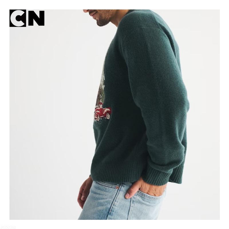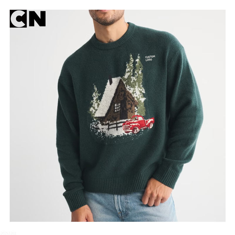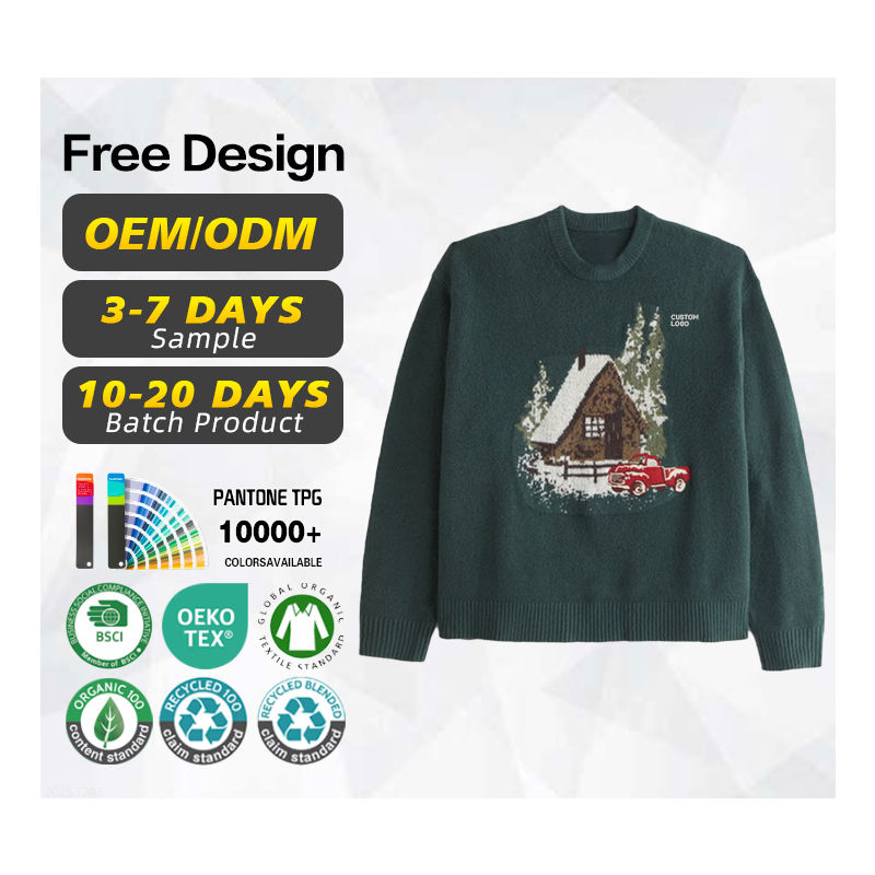 ผู้ผลิตเสื้อสเวตเตอร์ที่ได้รับการรับรอง GRS รับทำโลโก้ เสื้อสเวตเตอร์ผู้ชายผ้าฝ้ายผสมไนลอนทรงโอเวอร์ไซส์ พิมพ์ลายกราฟิก เสื้อสเวตเตอร์คริสต์มาสแบบถัก