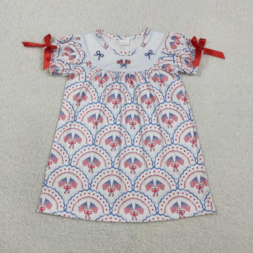 ชุดเดรสเด็กผู้หญิง GSD3525 RTS ลายดาววันชาติอเมริกา สีฟ้าประดับโบว์ สำหรับฤดูร้อน ระบายอากาศได้ดี ผ้าไม่ยับ ความยาวระดับเข่า ขายส่ง ODM