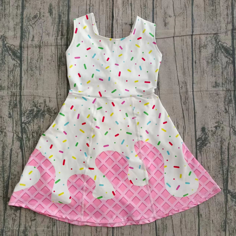 ชุดโยคะเด็กสไตล์บูติกใหม่ GSD3594 ขายส่ง ชุดเดรสเด็กผู้หญิงลายพิมพ์ไอศกรีมสีชมพู สำหรับเด็กผู้หญิง