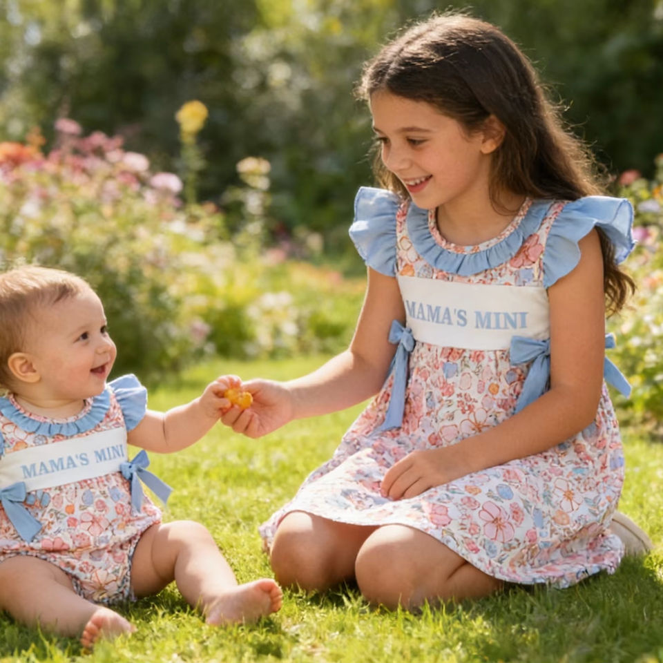 ชุดเดรสเด็กผู้หญิง GSD3648 RTS สำหรับฤดูร้อน ระบายอากาศได้ดี ความยาวระดับเข่า ลายดอกไม้ แขนบานเล็กน้อย สไตล์มินิ ชุดเซ็ตสำหรับพี่สาว