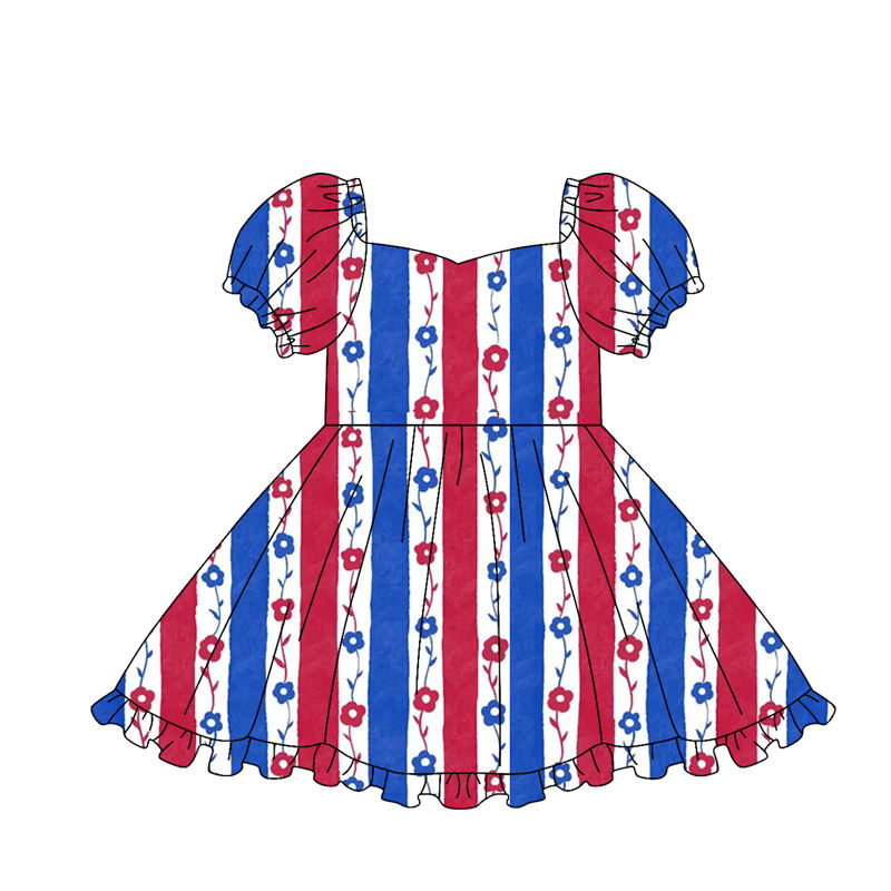 GSD3791เดรสแขนสั้นลายทางยาวถึงเข่าพิมพ์ลายดอกไม้สีแดงสีฟ้าสีขาวสำหรับเด็กผู้หญิงฤดูร้อนขายส่ง