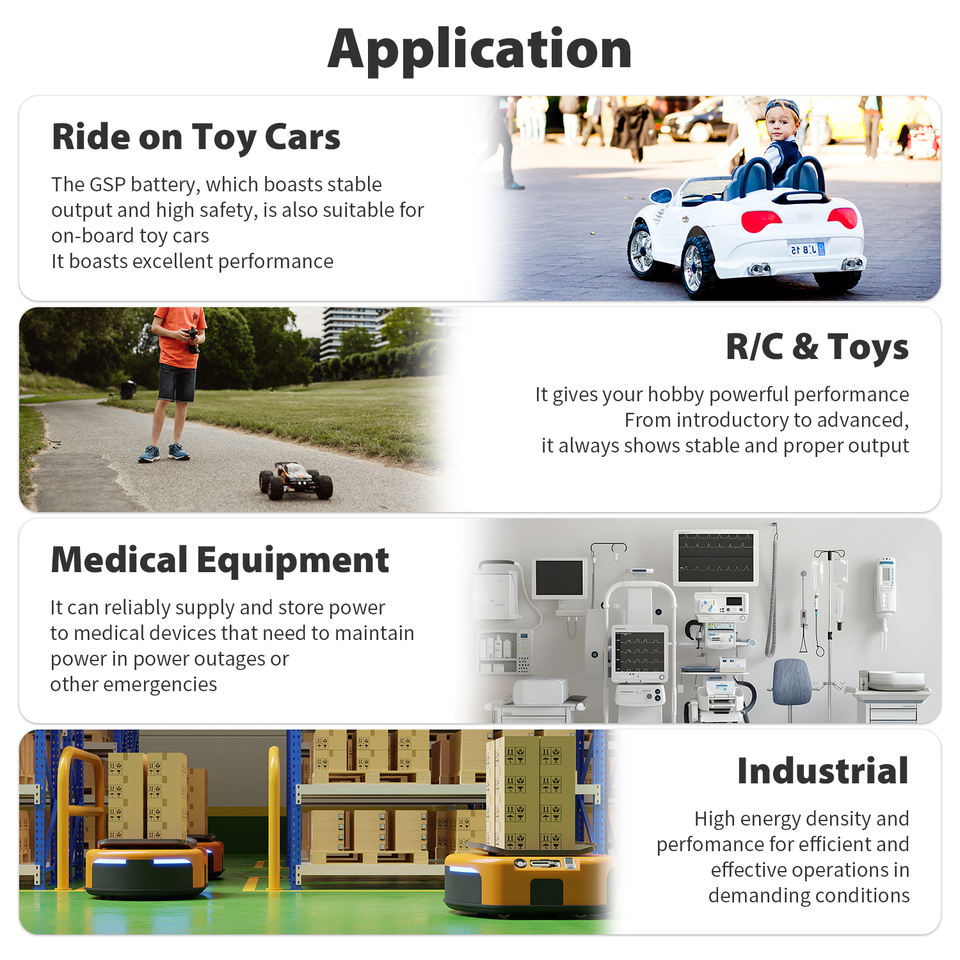 Toys, Power Tools, Home Appliances, Consumer Electronics, Electric Bicycles/Scooters, Electric Folklifts, electric vehicles, Electric Wheelchairs, Electric Power Systems, Solar Energy Storage Systems, Uninterruptible Power Supplies, Energy Storage, UPSApplication