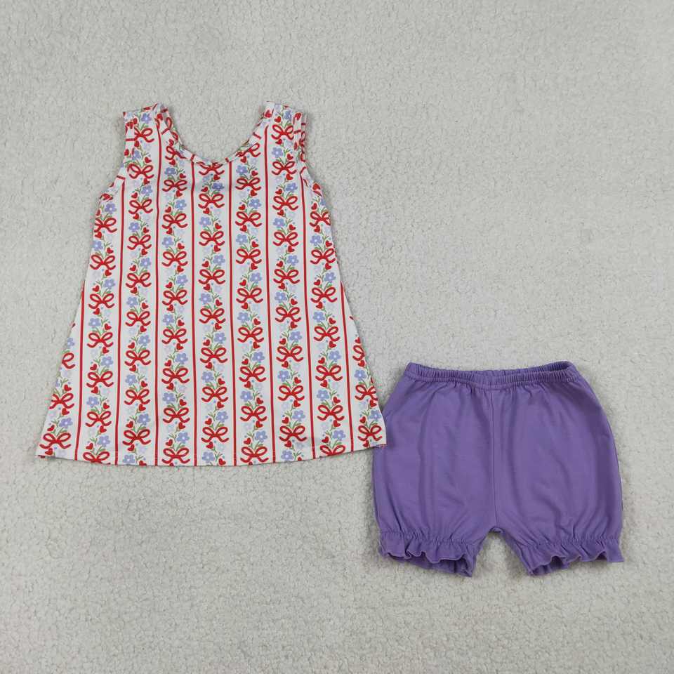 ชุดเด็กผู้หญิง GSSO2785 ลายดอกไม้สีฟ้า โบว์สีแดง ชุดเซ็ตแขนกุดสำหรับเด็กผู้หญิง ขายส่ง