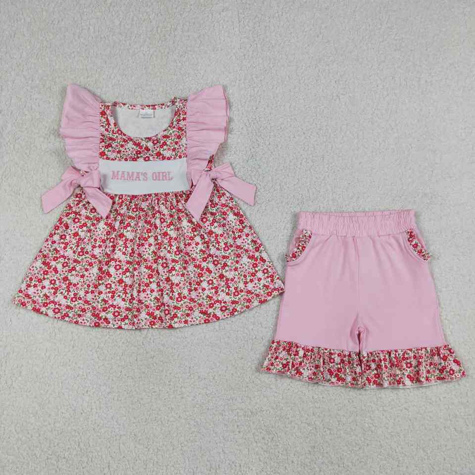 GSSO3131 RTS Little Active Girl pink mama's girl embroidery short Sleeve Outfits Kids Wholesale Children's Set