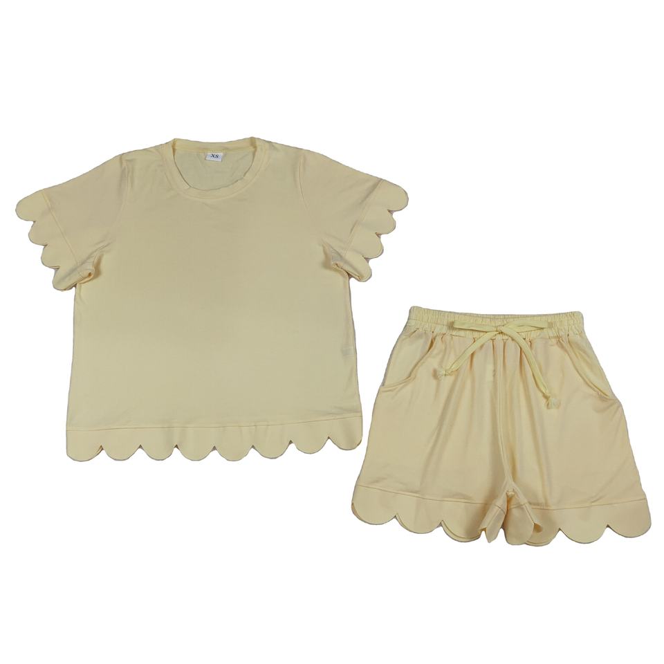 ชุดกีฬาผู้หญิงผ้าฝ้ายพิมพ์ลายสีเหลืองอ่อน GSSO3203 สำหรับผู้ใหญ่ ขายส่งจากร้านบูติก
