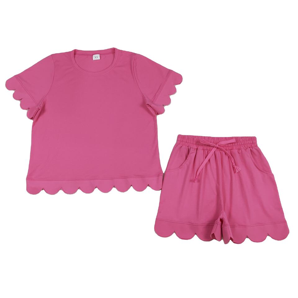 GSSO3204 rts hot pink solid print Boutique Wholesale cotton adult outfits for Adult Women Sport scallop set