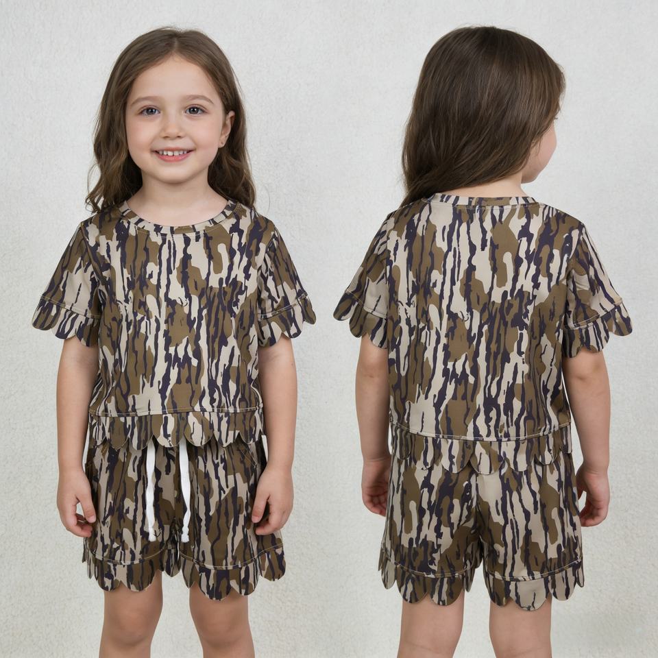 GSSO3225 rts Little Active Girl ชุดลำลองแขนสั้นลายพรางสีเขียวมะกอกสำหรับเด็กขายส่งชุดเด็กทรงสแกลลอป