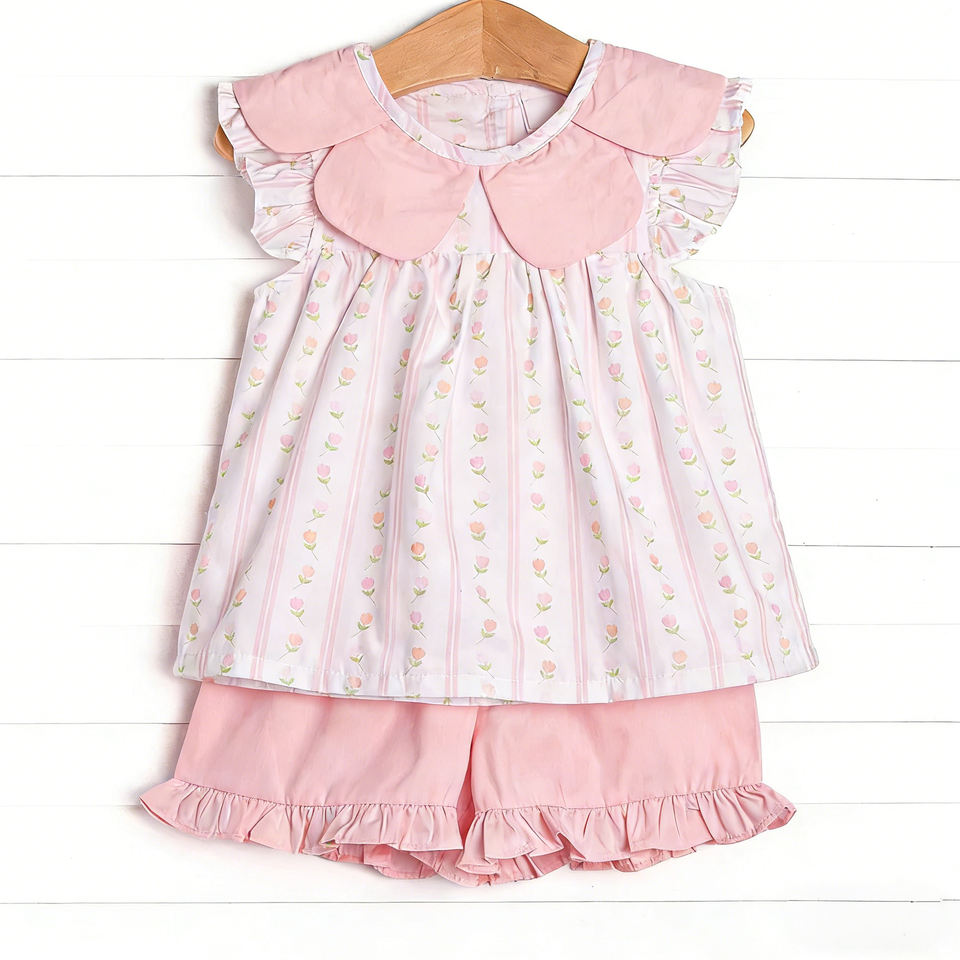 ชุดเด็กผู้หญิงแขนสั้นพิมพ์ลายดอกไม้สีเขียวลายทางสีชมพูสำหรับเด็กผู้หญิง GSSO3362กำหนดได้เอง
