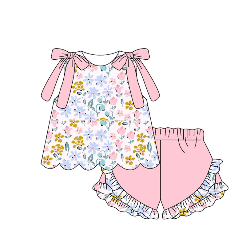 ชุดเสื้อผ้าเด็กผู้หญิงฤดูร้อนลายดอกไม้สีฟ้าอ่อนพร้อมโบว์ รุ่น GSSO3393 สำหรับเด็กเล็ก ขายส่งเสื้อแขนสั้นสำหรับเด็กผู้หญิง