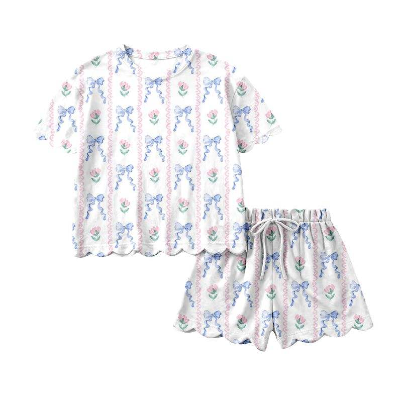 เสื้อยืดผ้าฝ้ายพิมพ์ลายดอกไม้สีชมพูประดับโบว์สีน้ำเงินแบบกำหนดเอง GSSO3405 สำหรับผู้หญิงขายส่งเสื้อผ้าบูติก