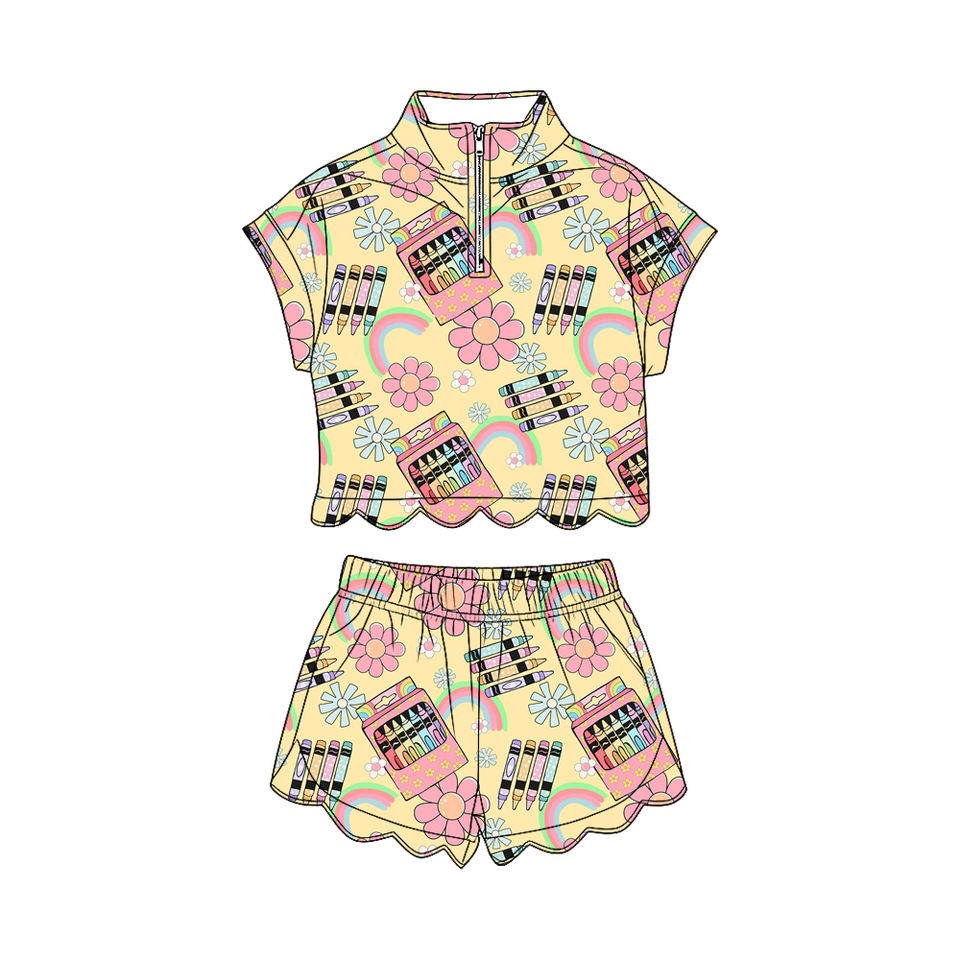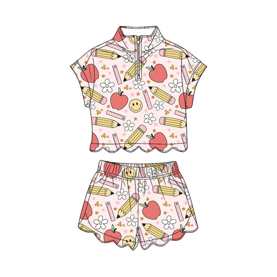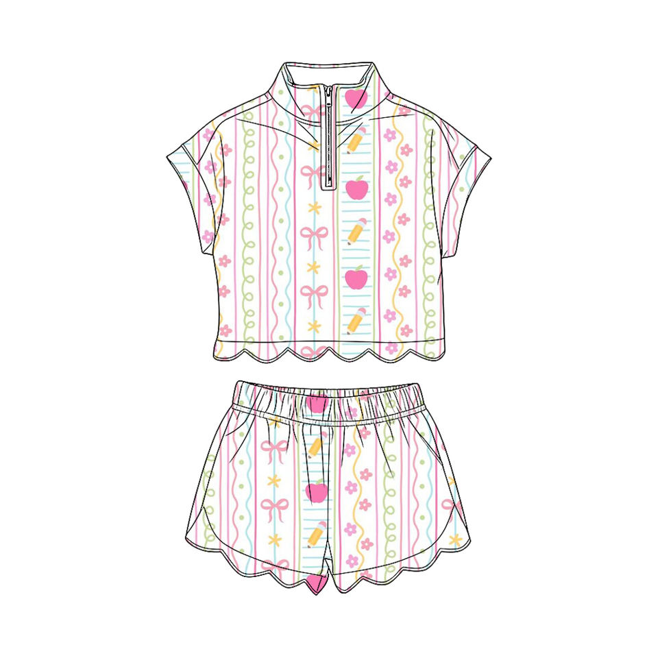 ชุดเซ็ตเด็กผู้หญิงแขนสั้นลายดอกไม้สีชมพูแบบมีซิป รุ่น GSSO3587 สำหรับเด็กเล็ก ขายส่ง