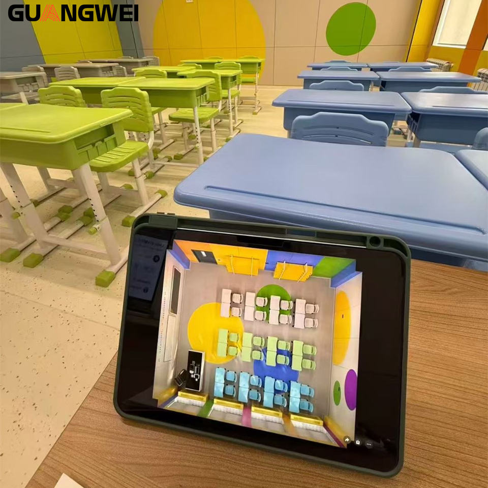 เฟอร์นิเจอร์โรงเรียนประถมขายส่ง GUANGWEI โต๊ะเรียนและเก้าอี้ปรับระดับความสูงได้ โต๊ะนักเรียนพลาสติกทันสมัย