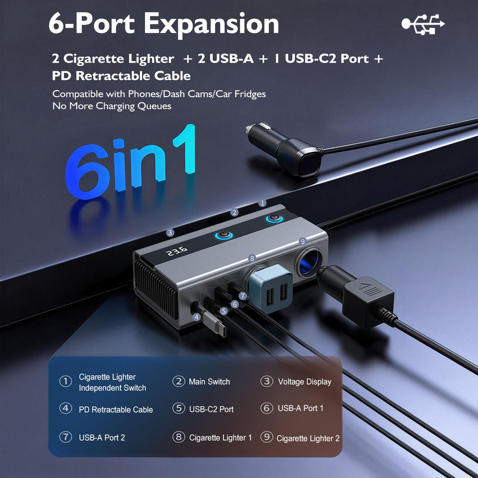 ที่ชาร์จในรถยนต์ GXY GC11 แบบเร็ว PD พร้อมไฟ LED แสดงสถานะการตรวจสอบแรงดันไฟฟ้า พอร์ต USB Type-C รองรับแรงดันไฟฟ้าเข้า 12-24V รับประกัน 1 ปี