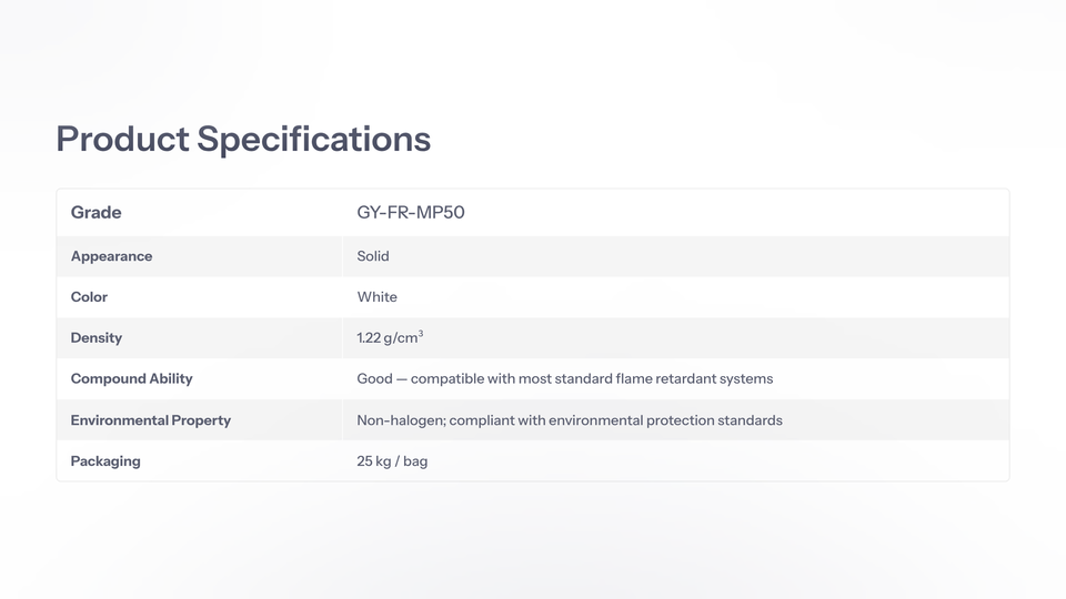GYC GY-FR-MP50 สารเคลือบโพลีโอเลฟินชนิดกันไฟแบบอินทูเมสเซนต์ประสิทธิภาพสูง เกรดสารประกอบแข็งเม็ดสีขาว ปราศจากฮาโลเจน