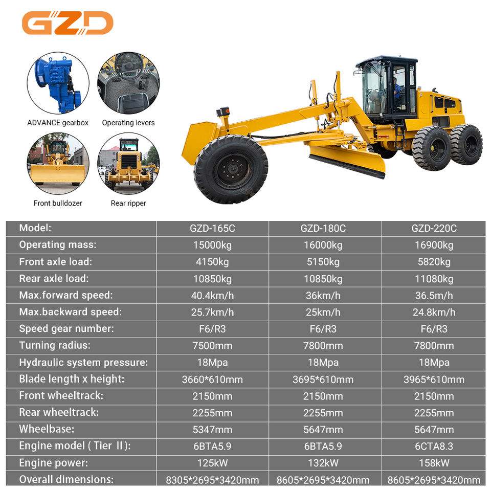 เครื่องปรับระดับพื้นดินสำหรับงานก่อสร้าง GZD กำลังไฟ 125 กิโลวัตต์ อุปกรณ์ปรับระดับงานหนัก รถเกรดเดอร์ 15 ตัน