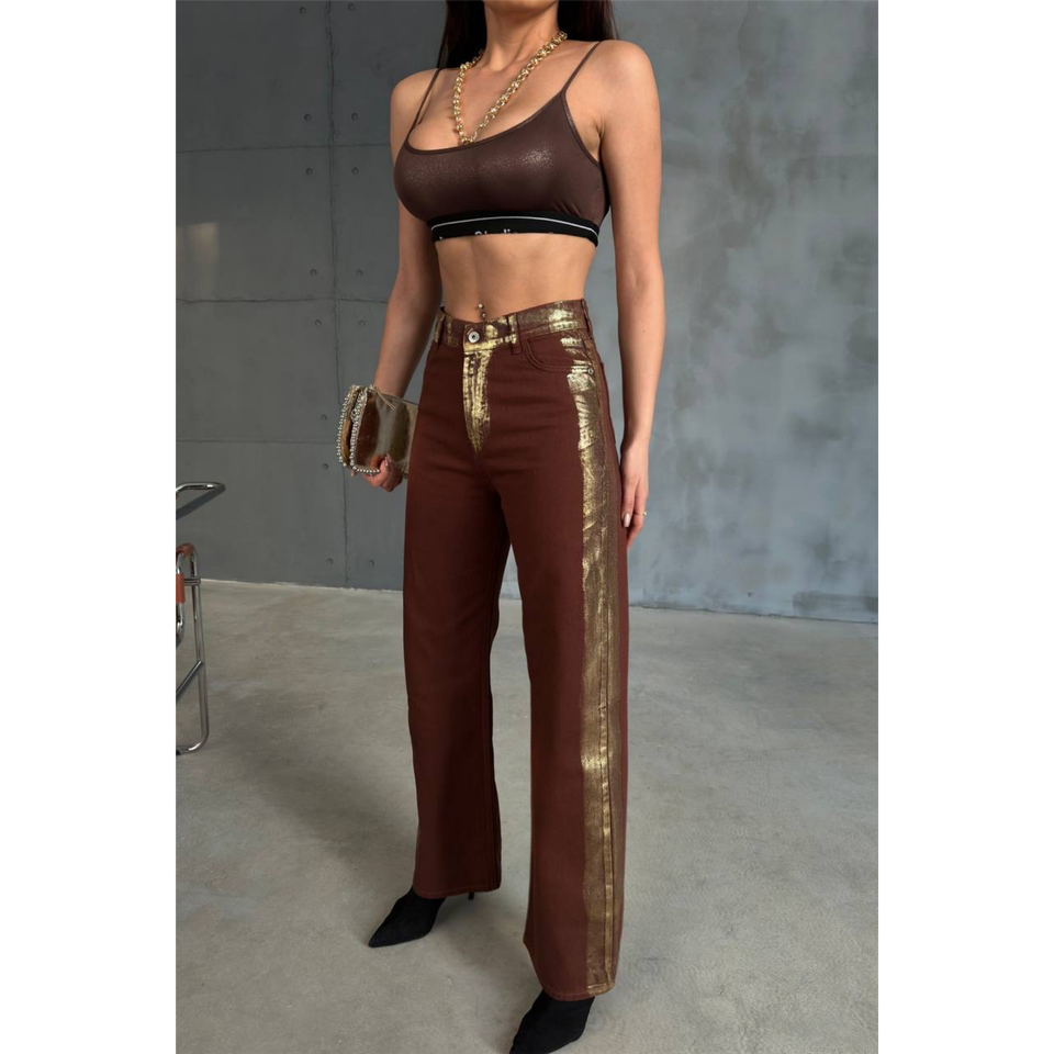 กางเกงขายาวทรงปาลาซโซผ้ากาบาร์ดีนสีน้ำตาลเอวสูงทรงขากว้างแฟชั่นสำหรับผู้หญิง