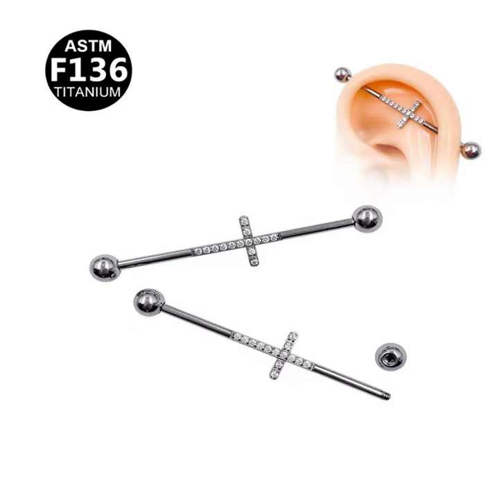 เครื่องประดับเจาะหูแบบแท่งไขว้ ไทเทเนียม G23 รุ่น Gaby New Design เกลียวภายนอก มาตรฐาน ASTM-F136 ชุบทอง ประดับเพชรซิร์คอน