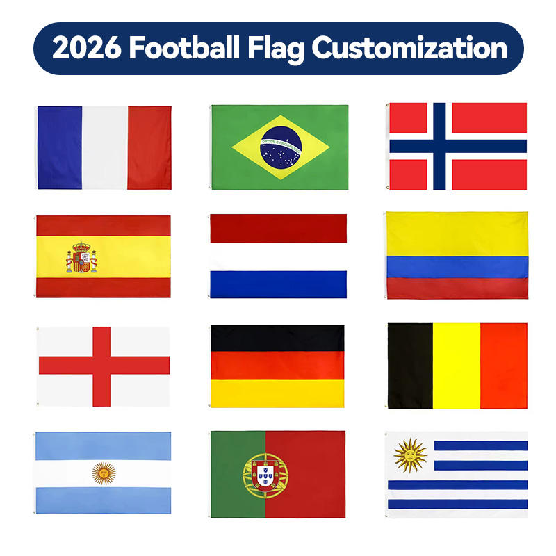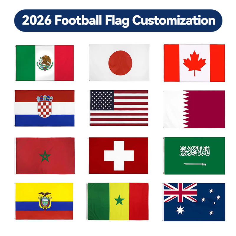 ธงแขวนโพลีเอสเตอร์แบบกำหนดเองราคาถูก ธงแฟนบอลกาฮูมิ 2026 แคนาดา เม็กซิโก สหรัฐอเมริกา ฟุตบอล อุรุกวัย ธงส่งเสริมการขายแบบพิมพ์ลาย