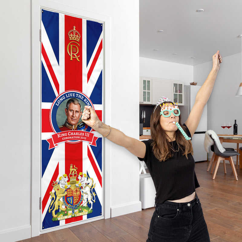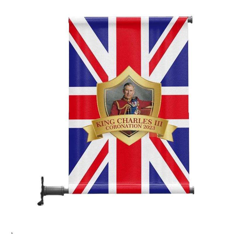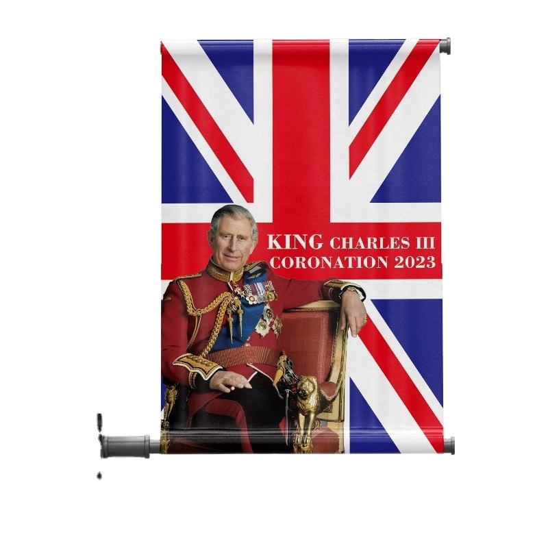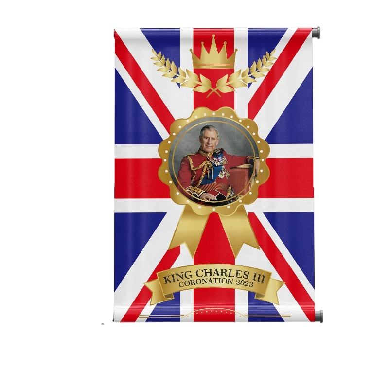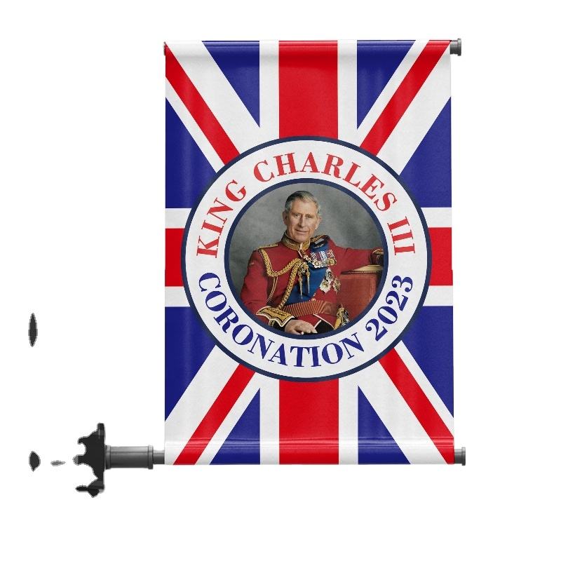 ธงพระมหากษัตริย์ชาร์ลส์ที่ 3 แบบสั่งทำพิเศษสองด้าน เป็นมิตรกับสิ่งแวดล้อม ผลิตจากโพลีเอสเตอร์ พิมพ์โลโก้สหราชอาณาจักร สำหรับโฆษณา