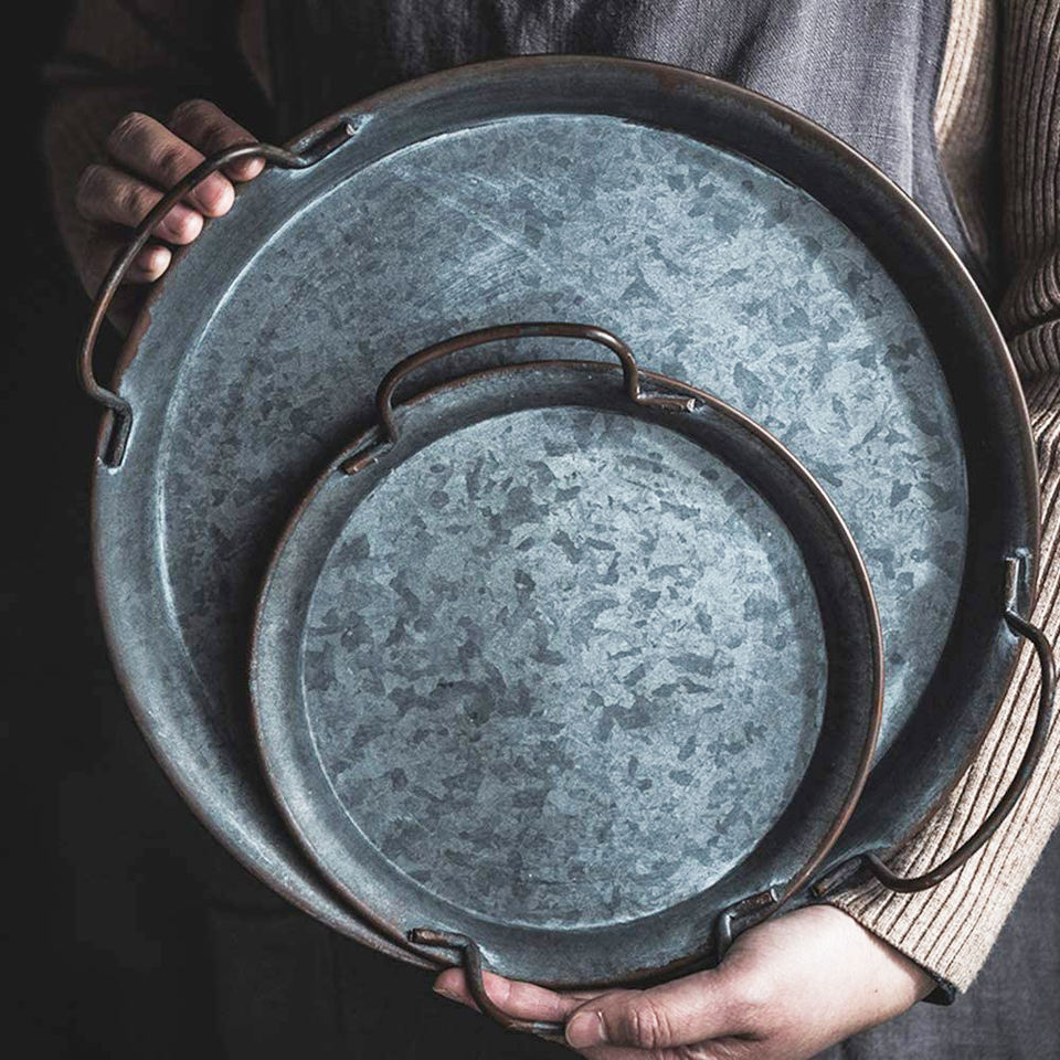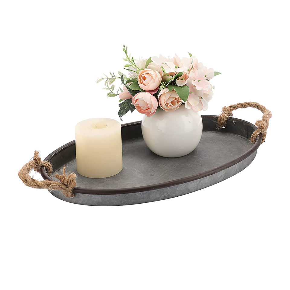 ถาดใส่ผลไม้เหล็กชุบสังกะสีทรงรีพร้อมที่จับเชือกถาดเก็บเค้กวินเทจสีดำแนวชนบทขายดีที่สุด