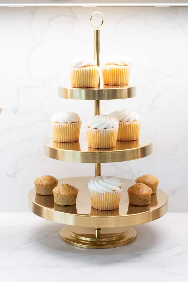 แท่นวางเค้กโลหะชุบสังกะสีพร้อมฐานไม้ตรงกลางโต๊ะสำหรับงานปาร์ตี้วันเกิดงานแต่งงาน