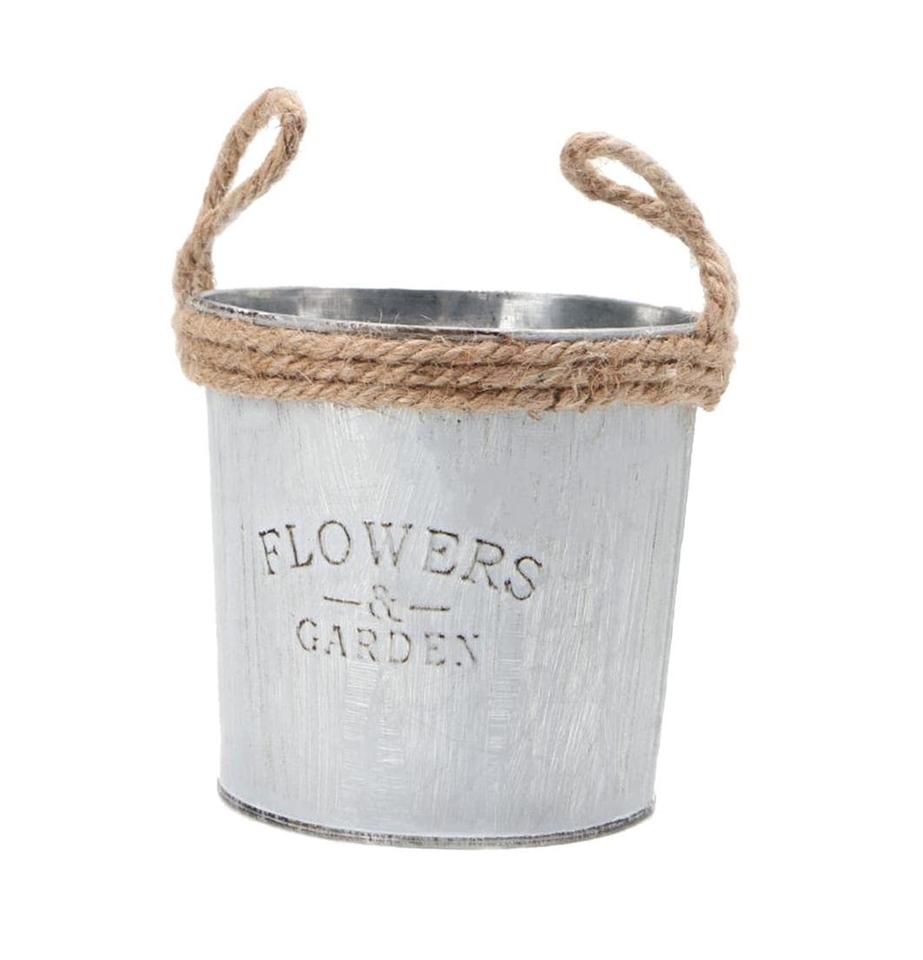 กระถางปลูกต้นไม้โลหะชุบสังกะสีแบบเรียบง่ายพร้อมหูหิ้วเชือกป่าน ปรับแต่งความจุได้สำหรับปลูกดอกไม้และจัดสวน