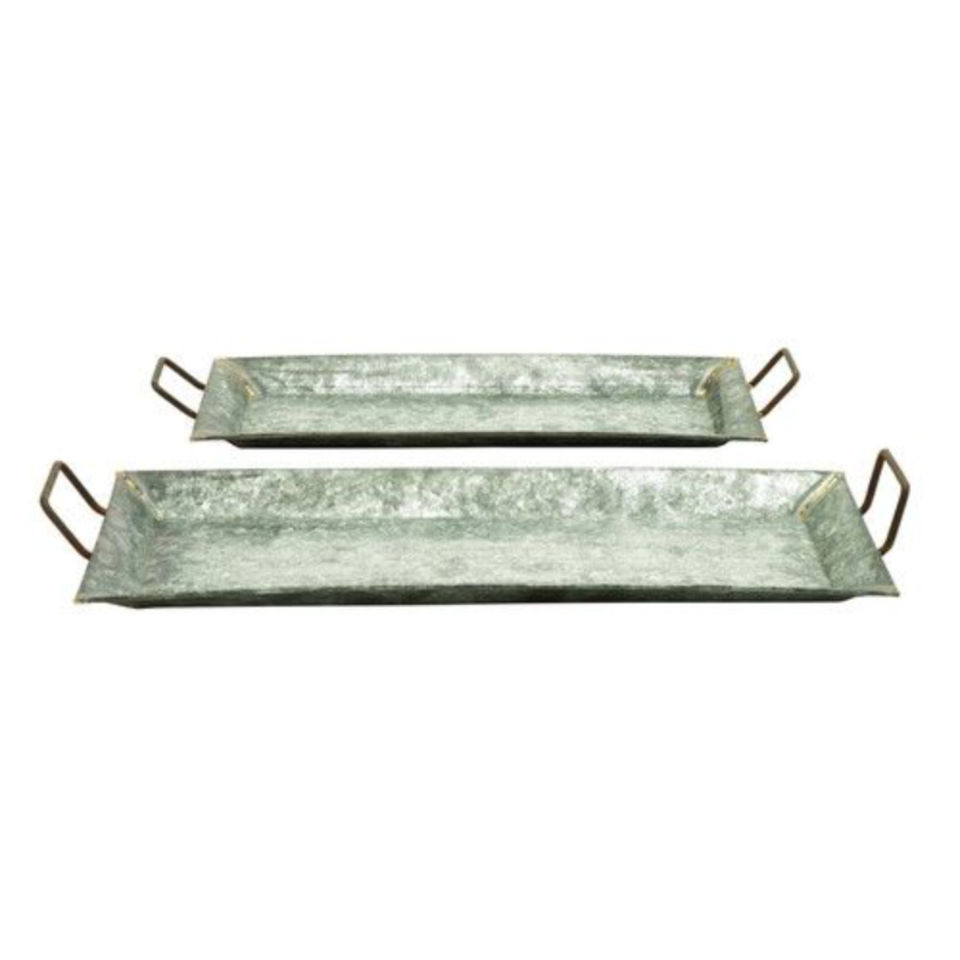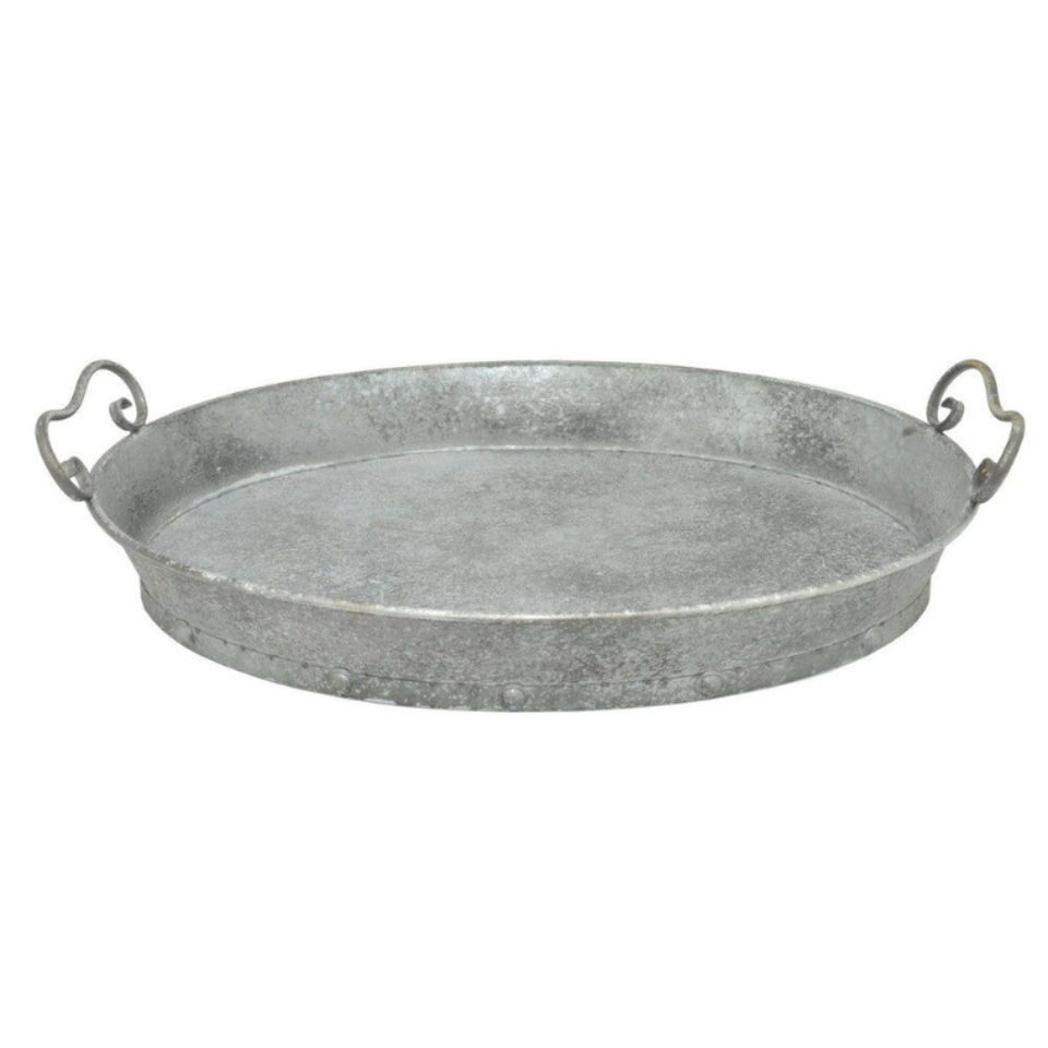 ถาดเสิร์ฟโลหะชุบสังกะสีพร้อมหูจับ ตกแต่งสไตล์ฟาร์มเฮาส์ ถาดเหล็กทรงสี่เหลี่ยมผืนผ้า ใช้ได้ทั้งภายในและภายนอกอาคาร สีเงิน สำหรับตกแต่งและจัดแสดง