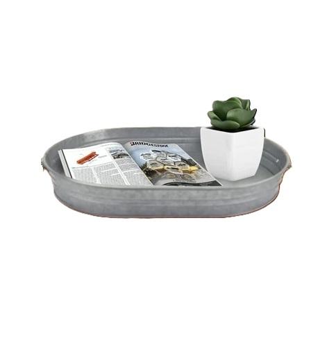 ถาดเสิร์ฟโลหะชุบสังกะสีพร้อมด้ามจับที่เก็บของทรงสี่เหลี่ยมผืนผ้าแนวอุตสาหกรรมแบบชนบทพร้อมที่จับเหล็ก