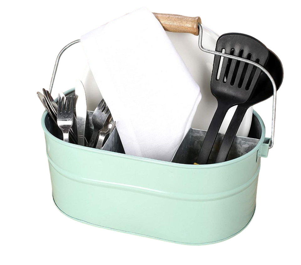 ที่ใส่เครื่องครัวโลหะชุบสังกะสีพร้อมด้ามจับไม้ 4 ช่อง ทนทาน ใช้สำหรับวางบนเคาน์เตอร์ครัว ใส่ช้อนส้อมและเครื่องปรุง