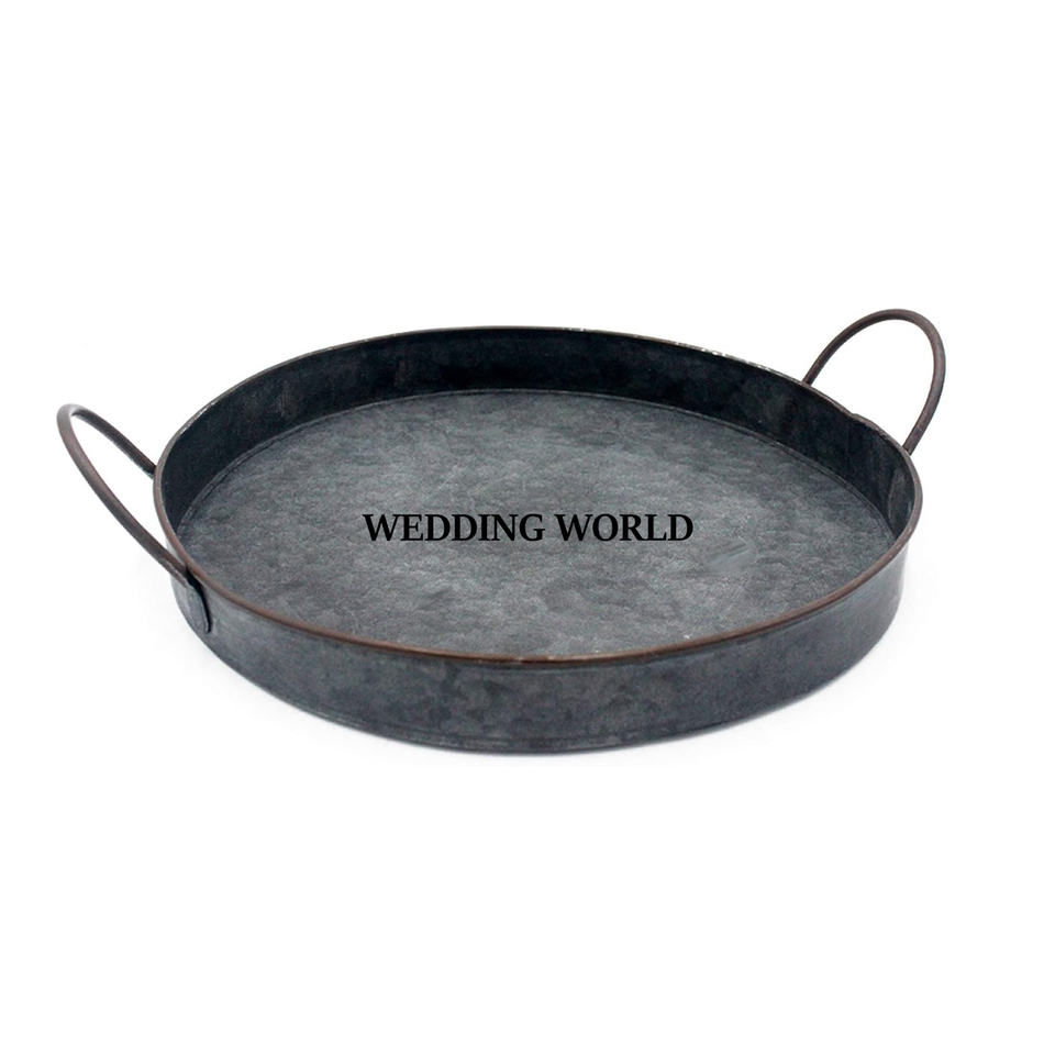 ถาดเสิร์ฟอาหารชุบสังกะสีแบบทำมือทรงกลมอุปกรณ์สำหรับงานแต่งงานอุปกรณ์รับประทานอาหารสุดหรูถาดเสิร์ฟทำจากโลหะ