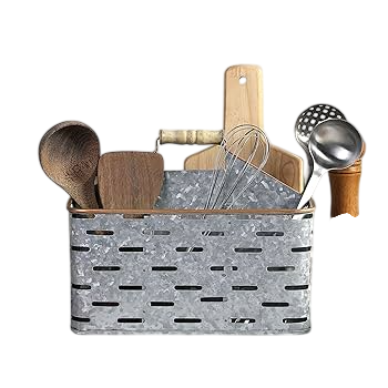 ตะกร้าใส่เครื่องครัวโลหะชุบสังกะสีสีเงิน ขอบสีทองแดง พร้อมด้ามจับไม้ สำหรับจัดระเบียบโต๊ะอาหารสไตล์ฟาร์มเฮาส์ มีจำหน่าย