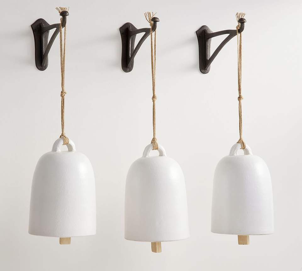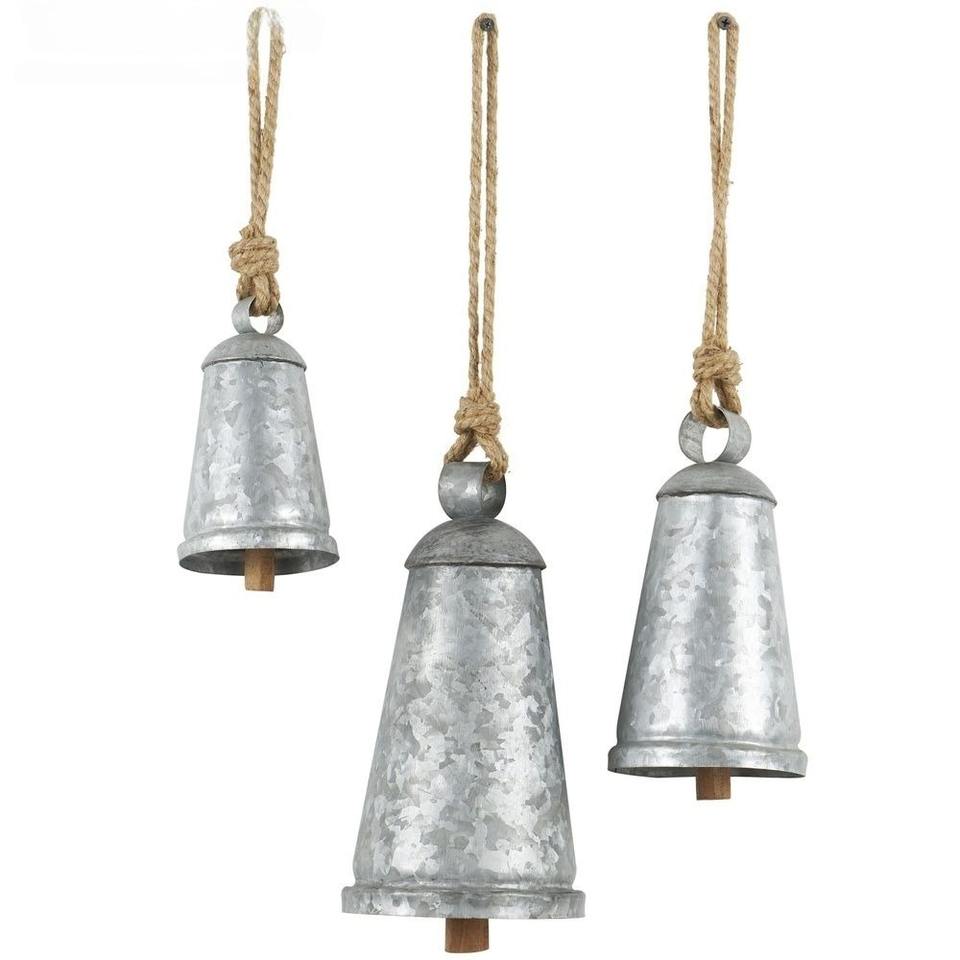 กระดิ่งสามชิ้นโลหะสังกะสีชุบสังกะสีพร้อมเชือกแบบเรียบง่ายสำหรับตกแต่งบ้านไร่และตกแต่งด้วยสำเนียงสีเงินอุตสาหกรรม