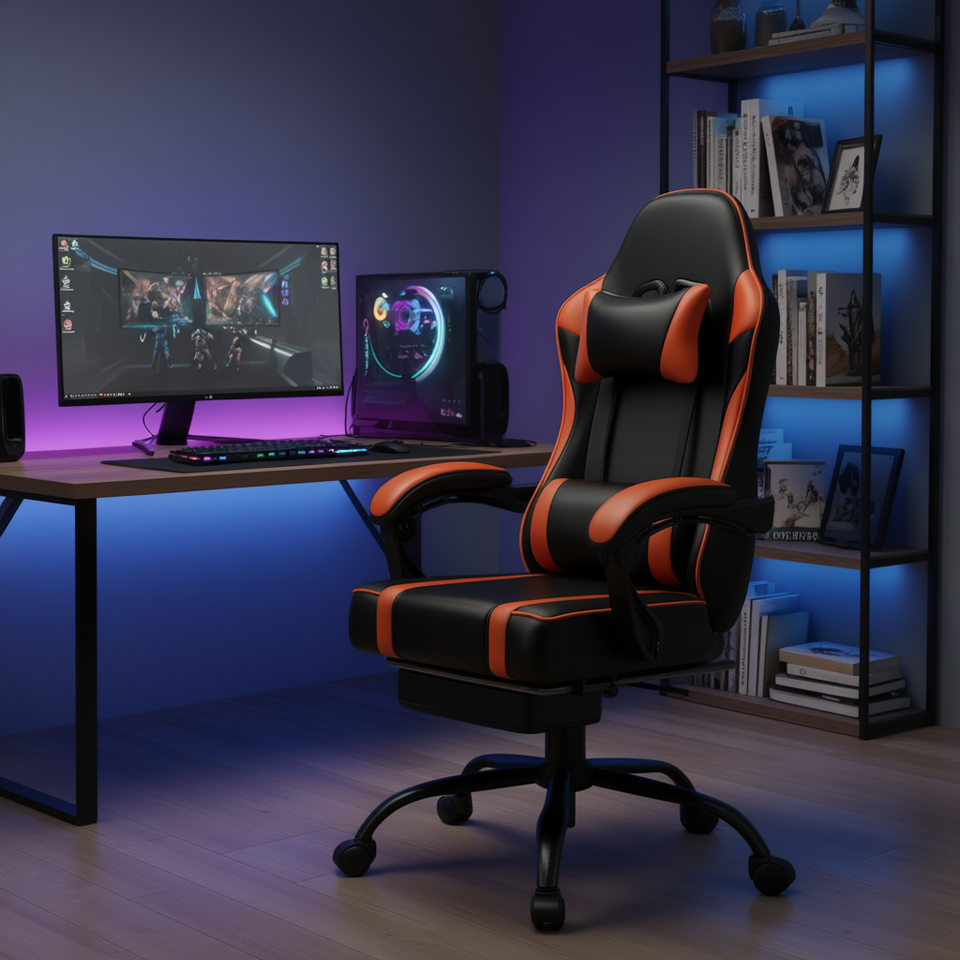 เก้าอี้เกมมิ่ง หนัง PU สีดำส้ม หมุนได้ พร้อมหมอนรองหลัง ปรับเอนได้ สำหรับผู้ใหญ่ เก้าอี้คอมพิวเตอร์ เก้าอี้สำนักงาน