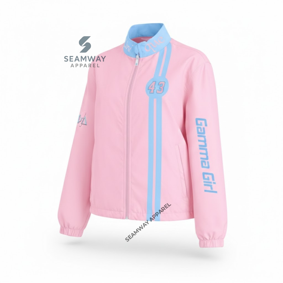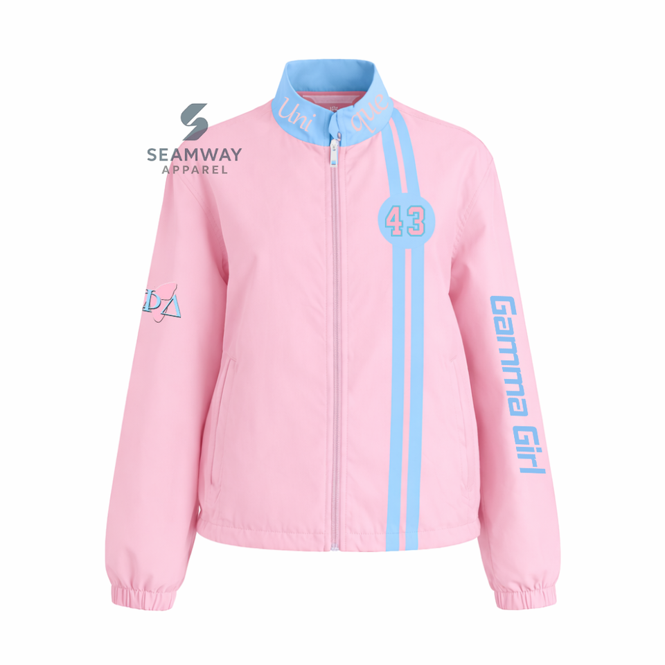 เสื้อแจ็คเก็ตแข่งรถผ้าคอตตอนทวิลล์ Gamma Phi Delta Sorority สำหรับผู้หญิง เสื้อแจ็คเก็ตมอเตอร์สปอร์ตสำหรับแข่งรถ เสื้อแจ็คเก็ตนักขี่มอเตอร์ไซค์สมรรถนะสูง
