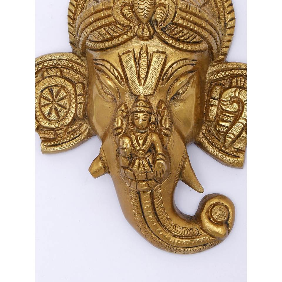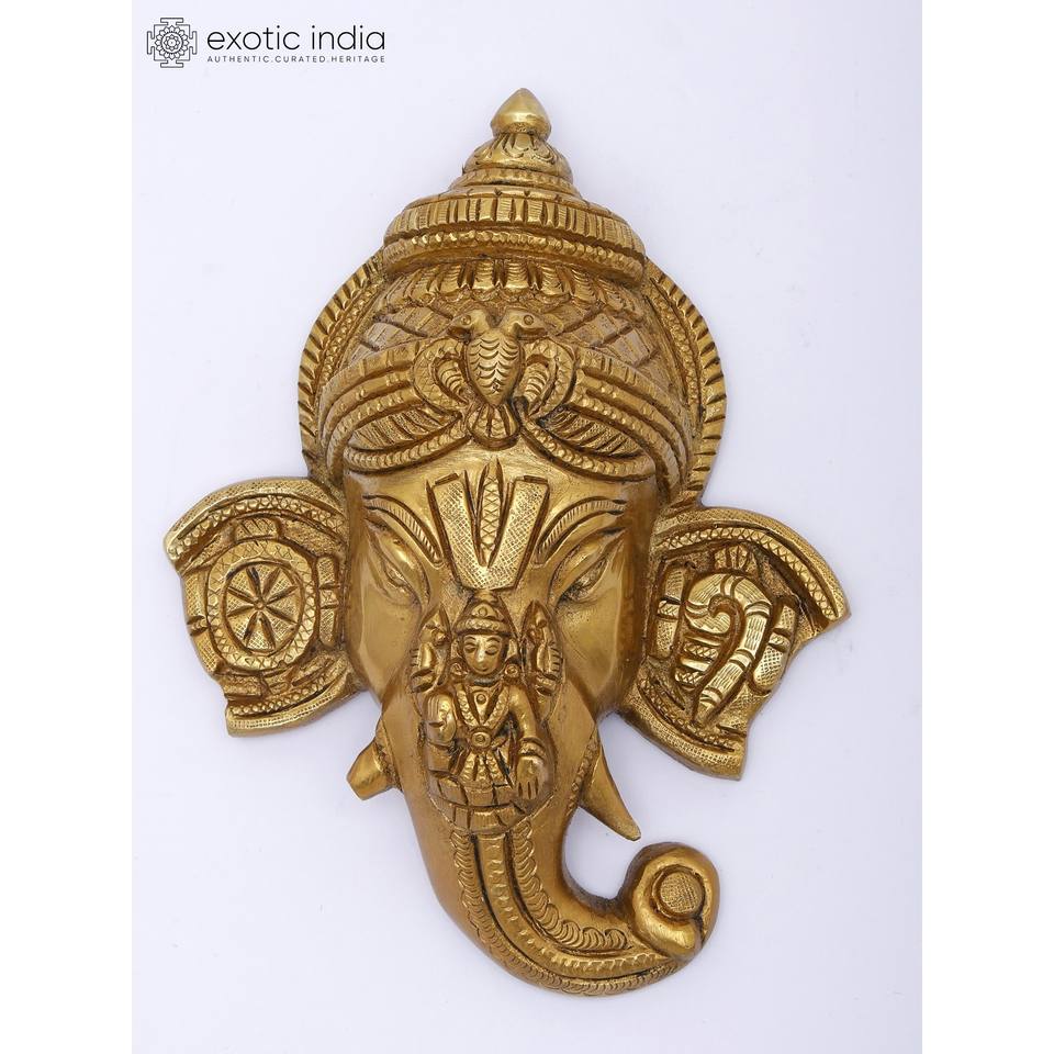 พระพิฆเนศผนังทองเหลืองแขวนกับ lakshmi และ gandabherunda พร้อมสัญลักษณ์จักระ