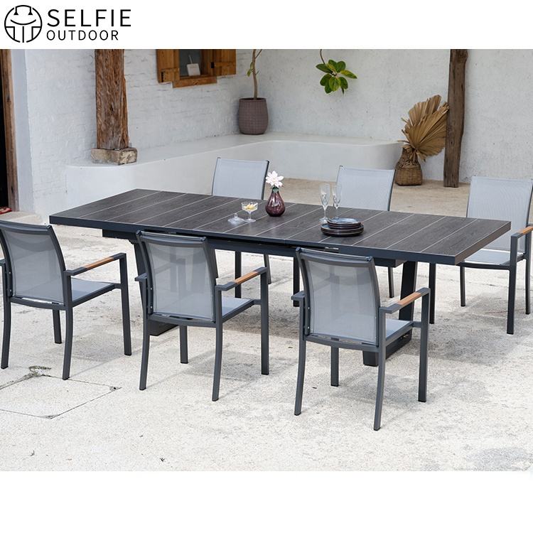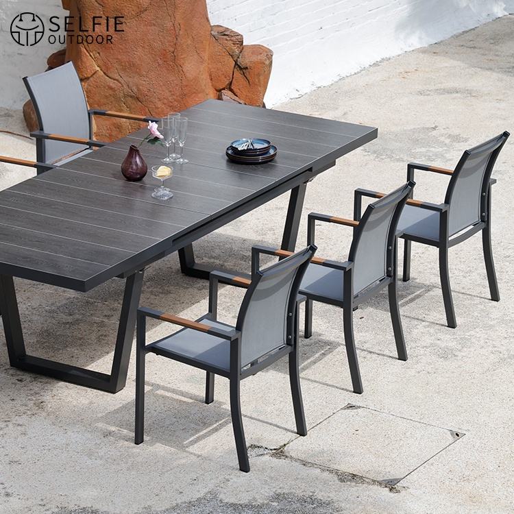 ชุดรับประทานอาหารอลูมิเนียมกลางแจ้งที่ทันสมัยพร้อมเก้าอี้โต๊ะแบบยืดได้สำหรับอพาร์ทเมนต์ลานสวนในโรงแรมและร้านอาหาร