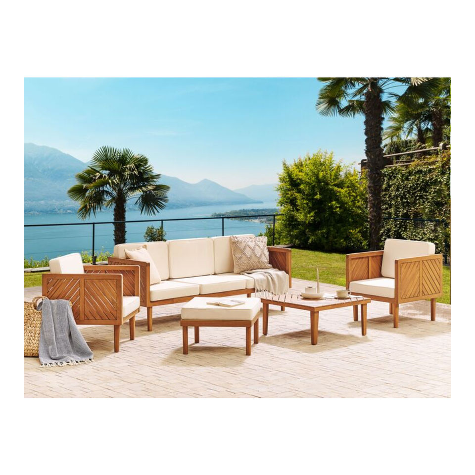 ชุดเฟอร์นิเจอร์สำหรับสวนประกอบด้วยโซฟา 3 ที่นั่ง, เก้าอี้นวม 2 ตัว, โต๊ะกาแฟ และเก้าอี้สตูล ทั้งหมดทำจากไม้กระถินณรงค์ที่ทนทาน