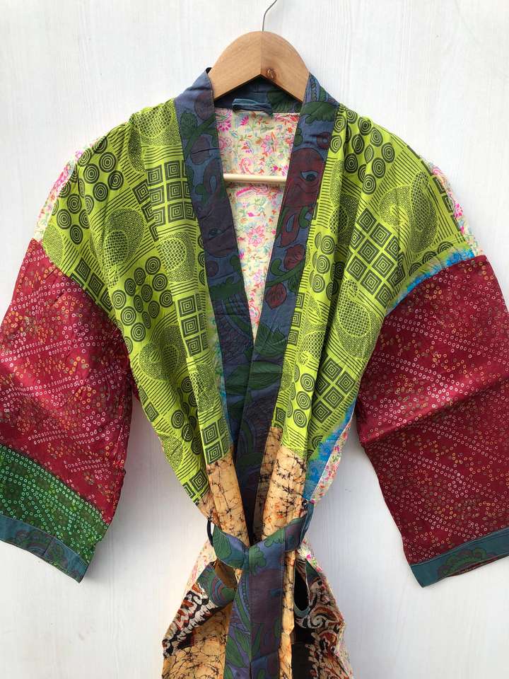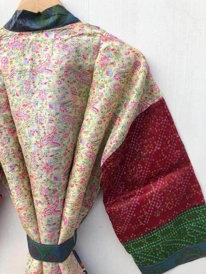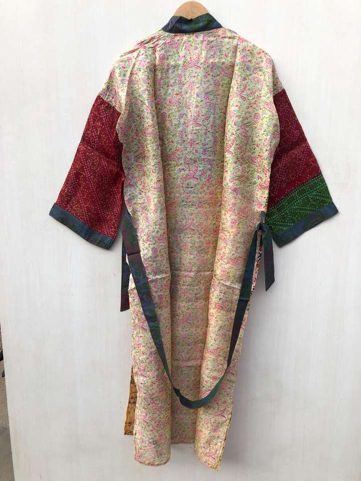 ชุดกิโมโนผ้าไหมลายดอกไม้ ชุดคลุมยาวแบบซารี ชุดกิโมโนซารีวินเทจ ชุดคลุมซารีเนื้อนุ่ม ชุดราตรีสำหรับงานปาร์ตี้ริมชายหาด ชุดกิโมโนผ้าไหมอินเดียทำมือ