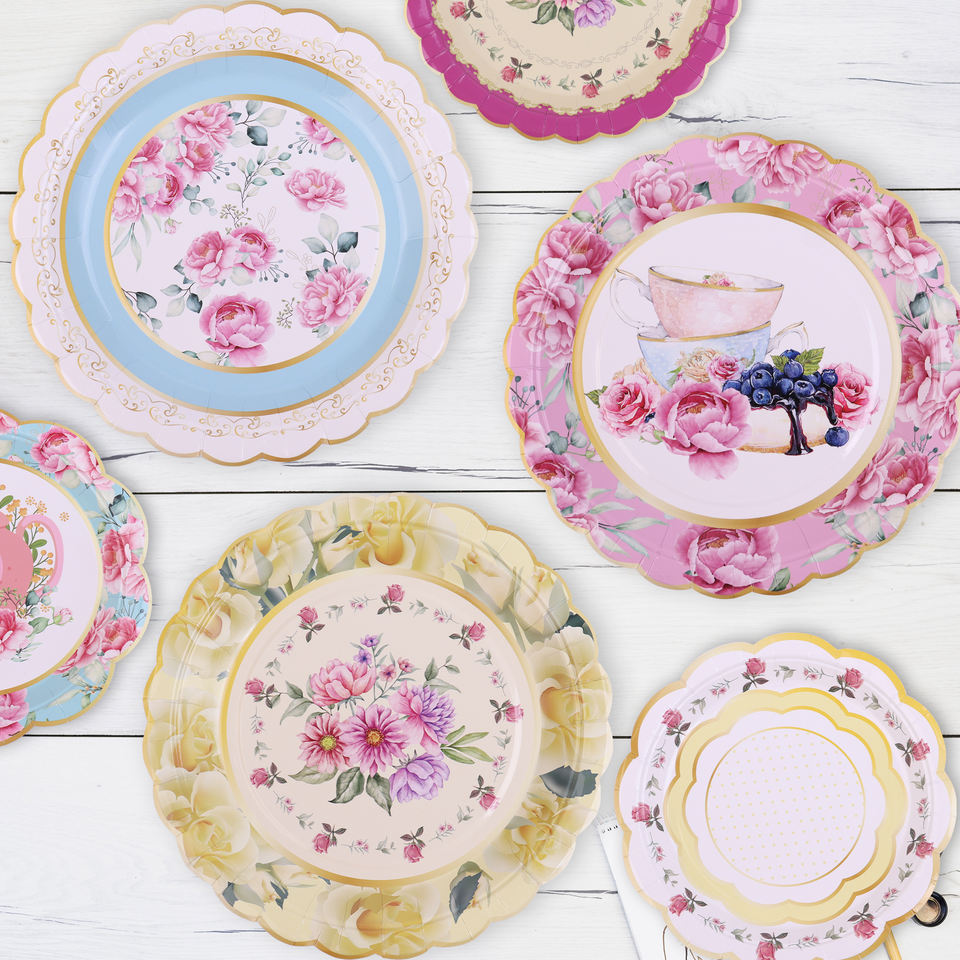 จัดเลี้ยงชาในสวน จานกระดาษลายดอกไม้ ผ้าเช็ดปาก ถ้วยชา และชุดจานรอง โต๊ะพูดคุย วินเทจ อุปกรณ์จัดเลี้ยงชา 8 คน