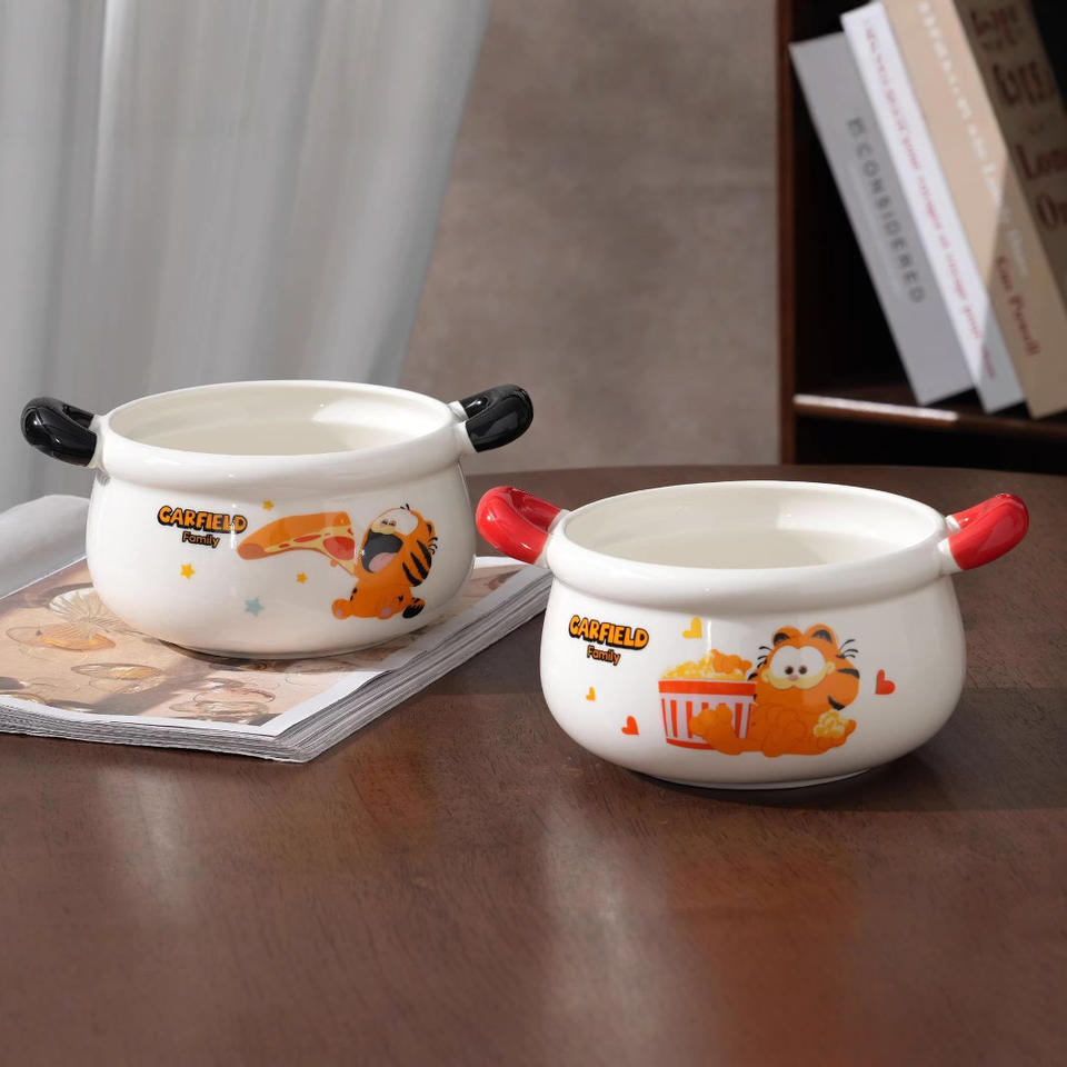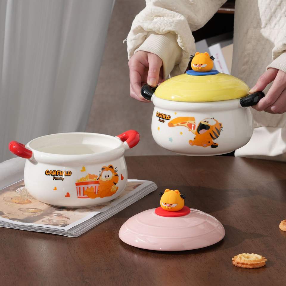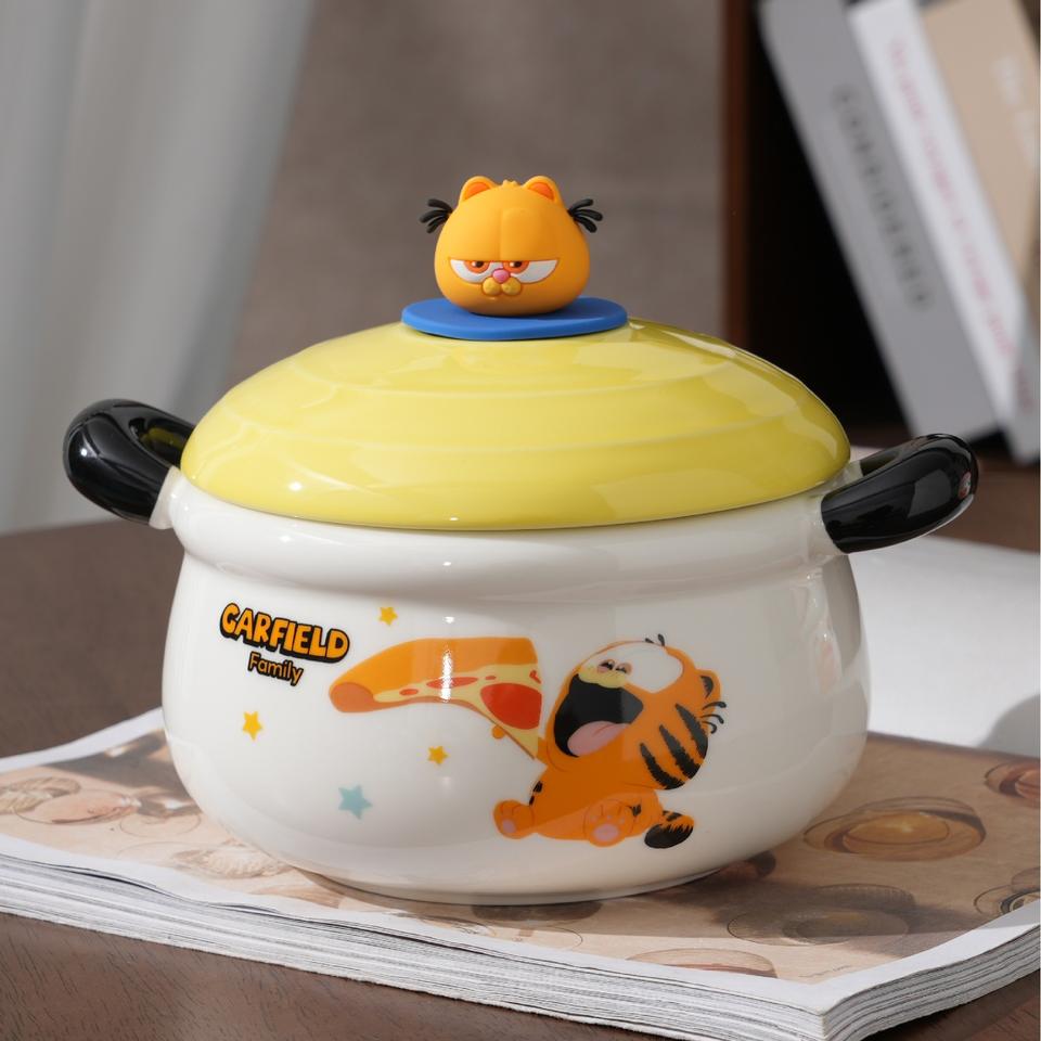 ชามบะหมี่กึ่งสำเร็จรูปเซรามิกการ์ฟิลด์พร้อมฝาปิด ลายการ์ตูนสีชมพูและสีเหลืองสำหรับเด็กและนักเรียน ฤดูร้อน 2024