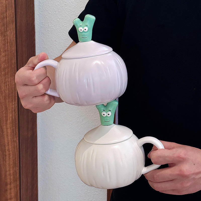 แก้วเซรามิครูปกระเทียมพร้อมฝาและหูจับ ลายการ์ตูน สีขาวม่วงอ่อน สำหรับใช้ในบ้านหรือเป็นของขวัญ ซัมเมอร์ 2025